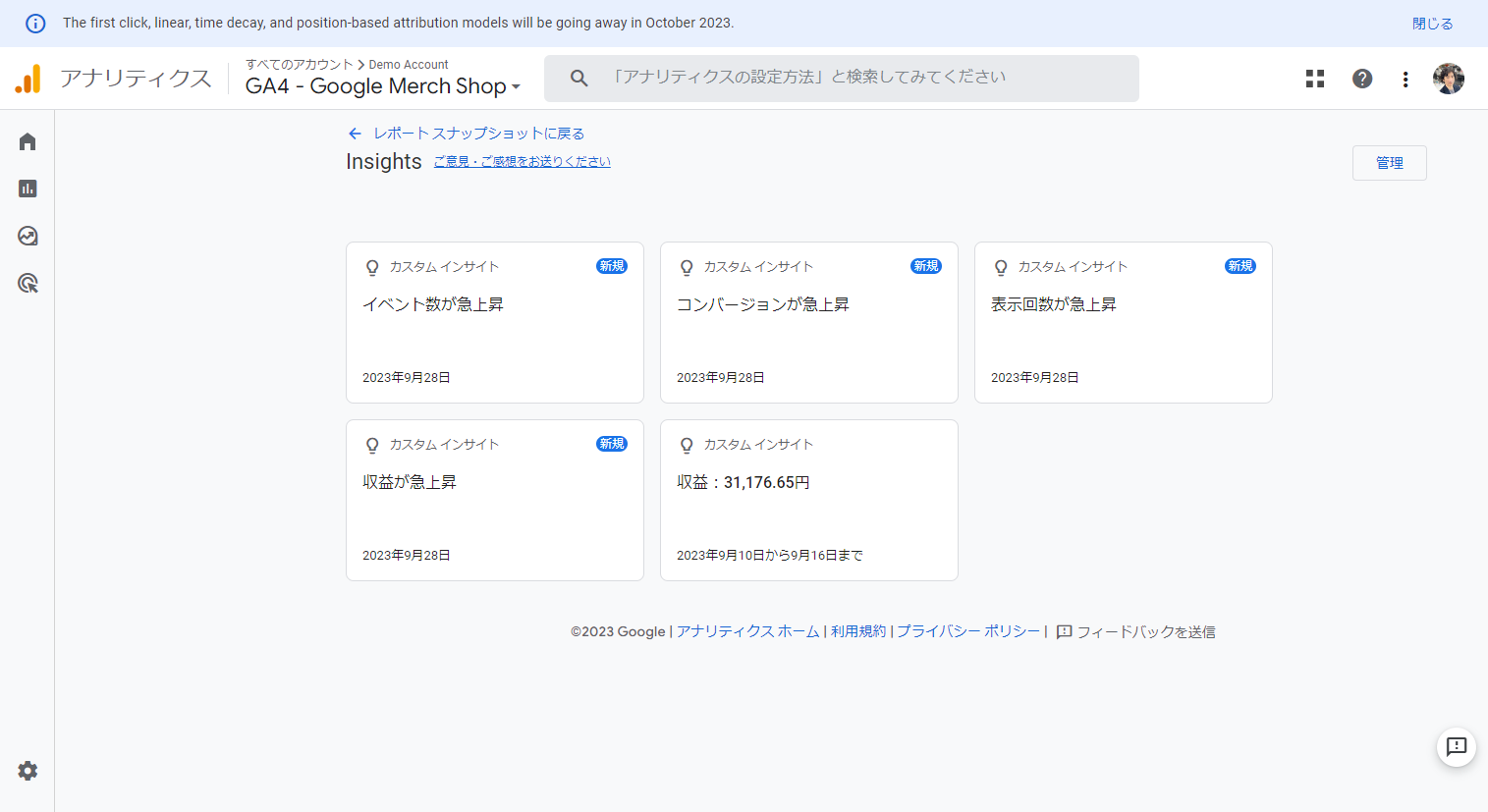 ※上記はGoogleデモアカウントの「Insights」の表示例