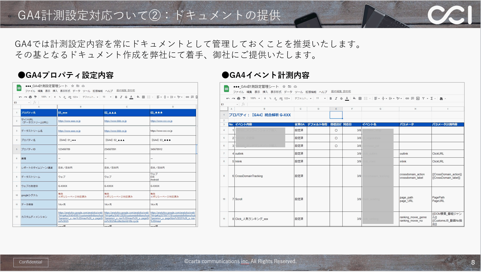 なお、GA4に関して言えば、CCIで導入作業をお任せいただいた場合、導入後には計測設計書を提供しています。導入後にお客様のご担当者様が振り返る際、「GA4のイベント●●●は、GTMでどのタグ、トリガー、変数が関係しているのか?」といった点が把握しやすくなると考えています。